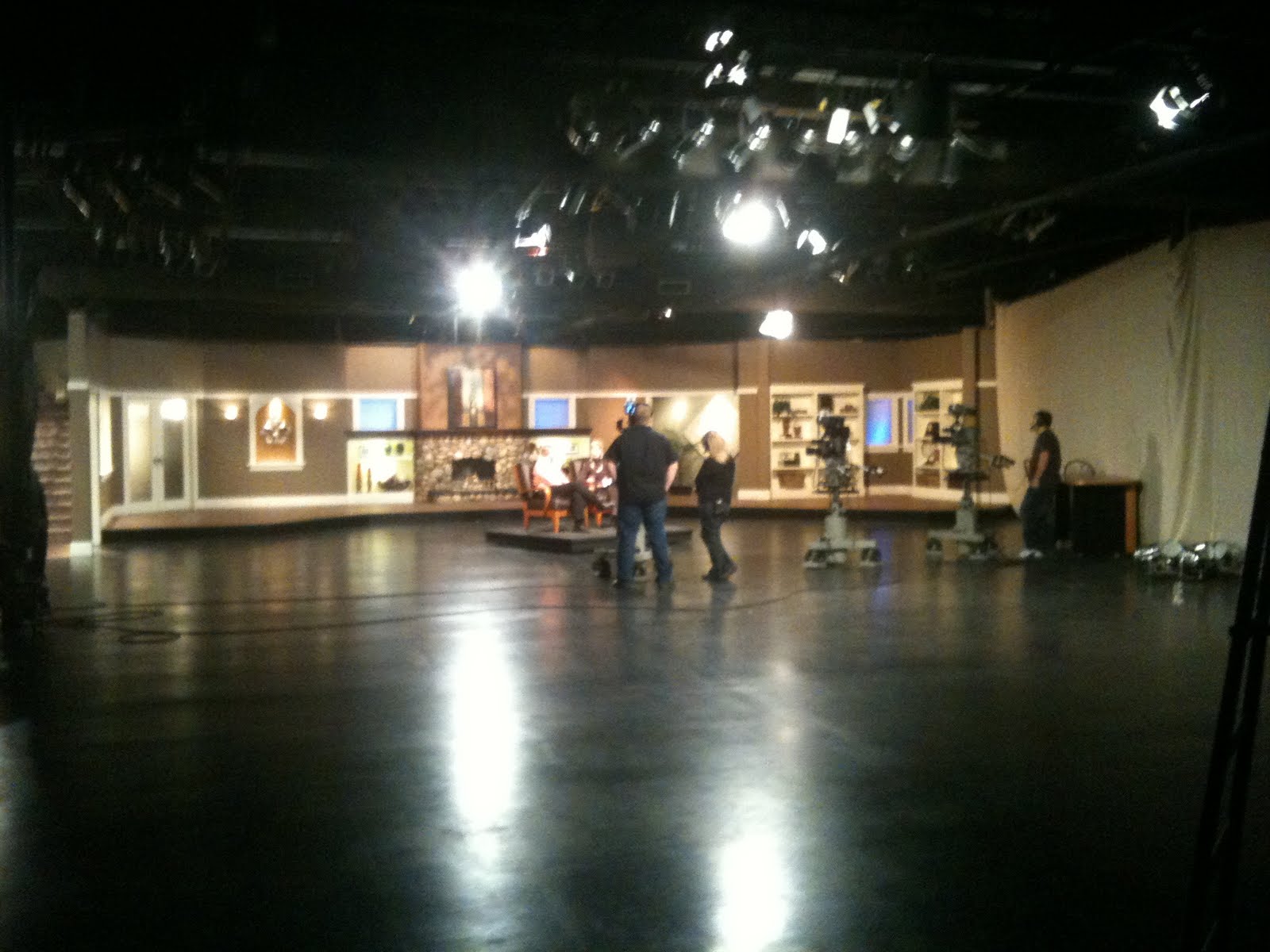 I was shocked by how big that was. Amazing. Only half the room was used, and you could probably run a thousand member church service in the half that contained the set. After watching them record the final segments preparing for mine, I was ushered to a table with three chairs—two for the husband and wife host couple (who were very professional and nicer than nice gets) and one chair for my little lonesome.